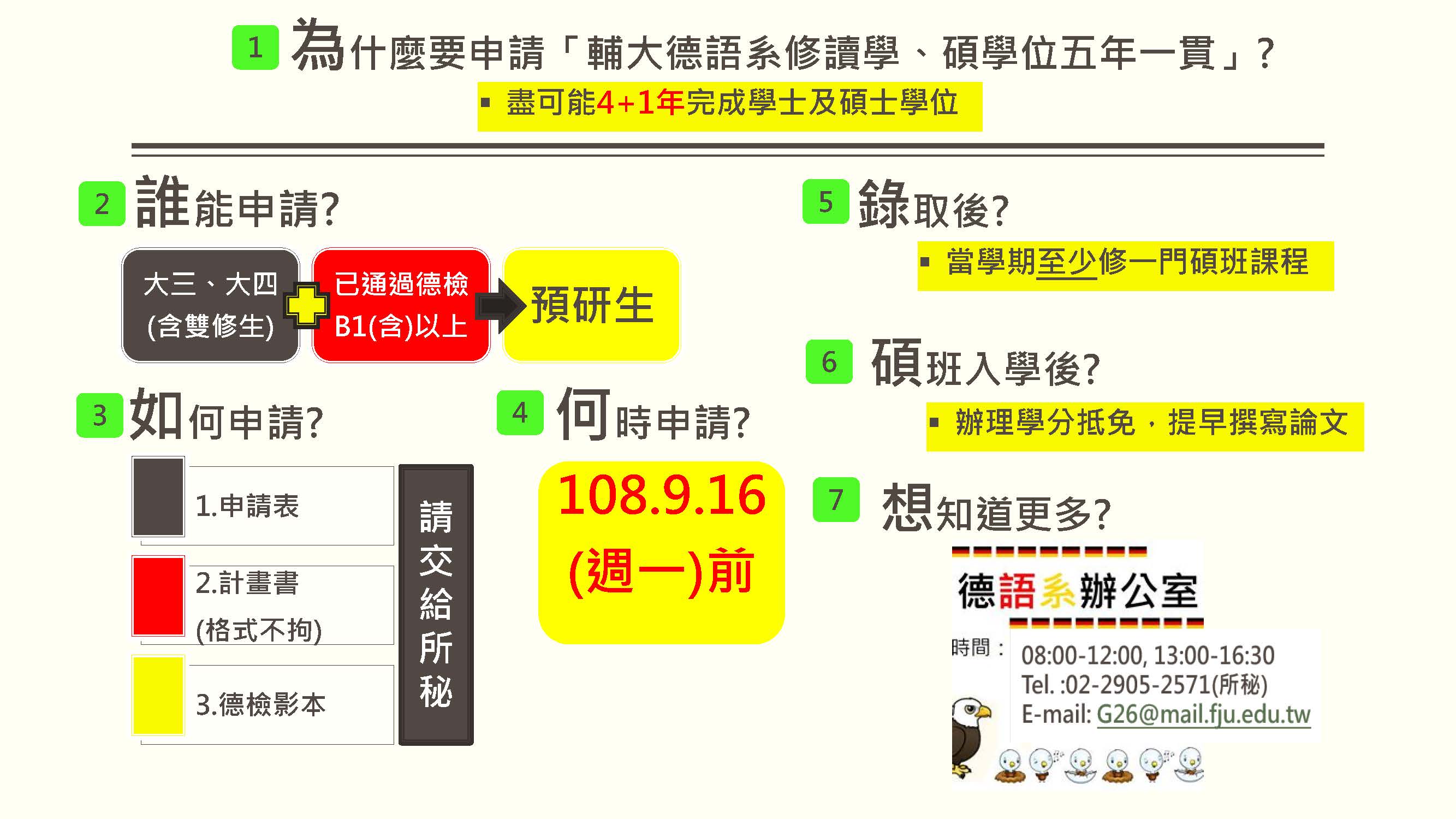 [系辦課務公告]108學年度第1學期德語系學生修讀「學、碩士學位五年一貫辦法」甄選申請公告(截止日:108.9.16週一)