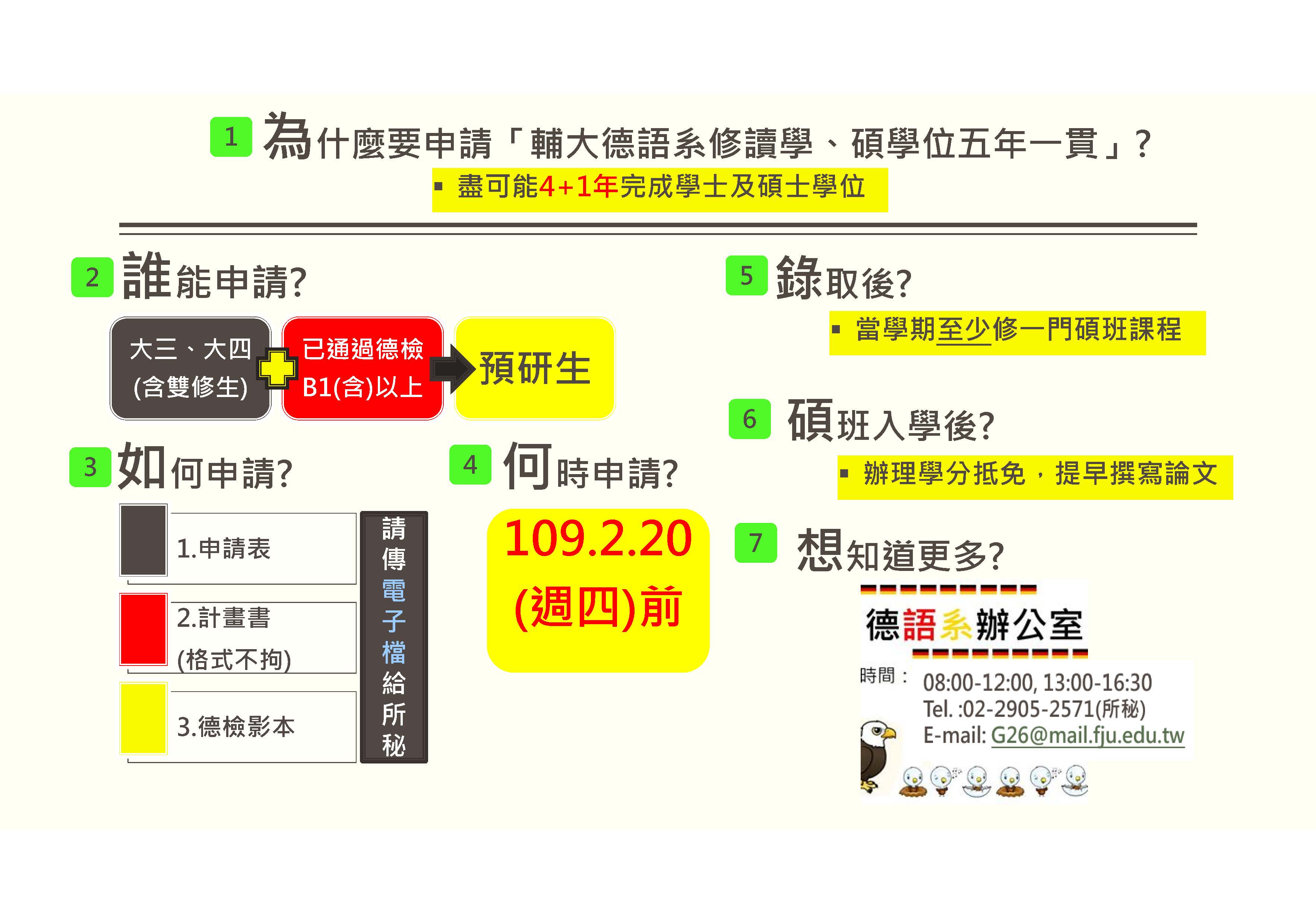 2020/02/06 11:17 [系辦課務公告]108學年度第2學期德語系學生修讀「學、碩士學位五年一貫辦法」甄選申請公告(截止日:109.2.20週四)