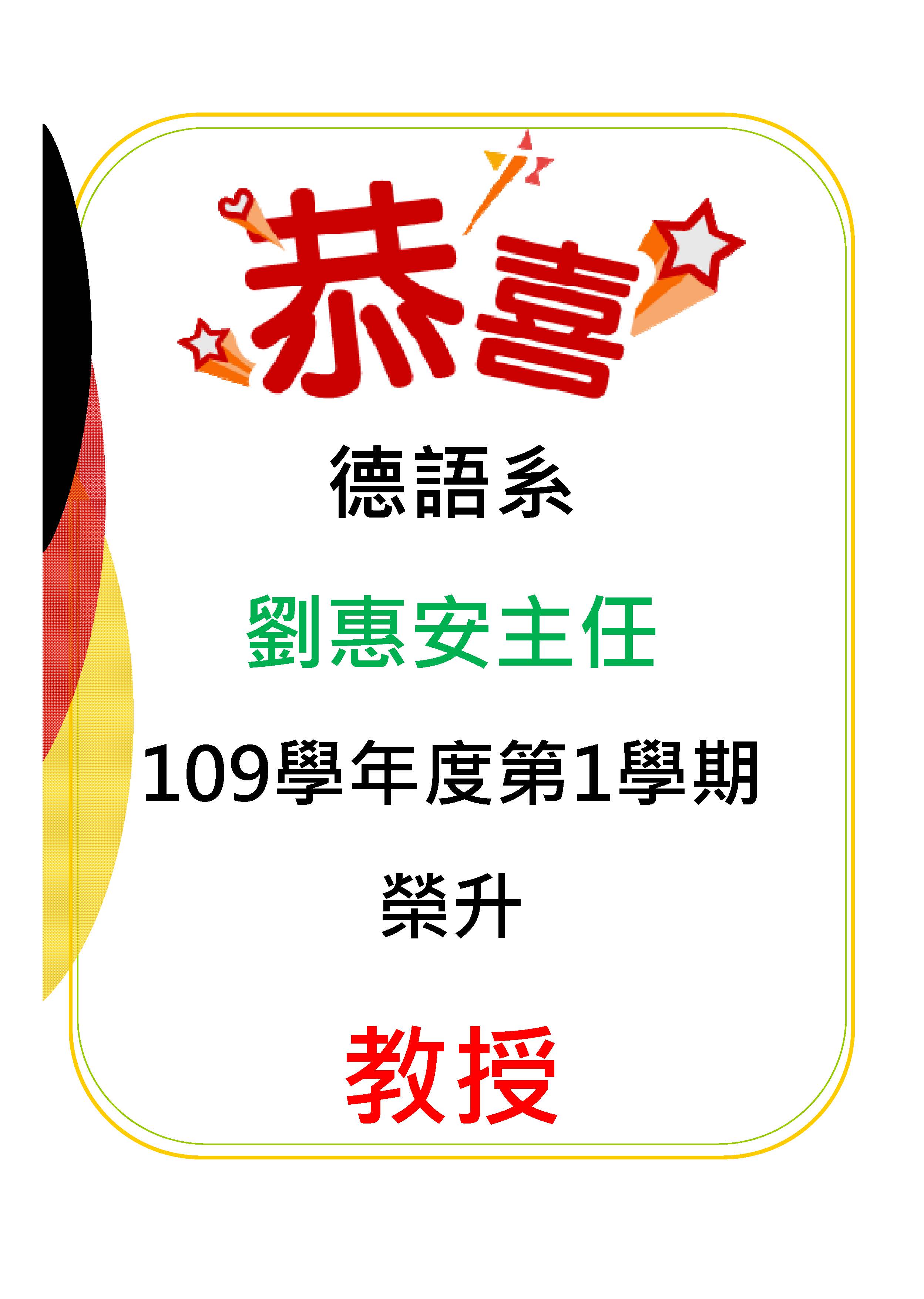 [榮譽榜]恭喜德語系劉惠安系主任109學年度第一學期榮升教授