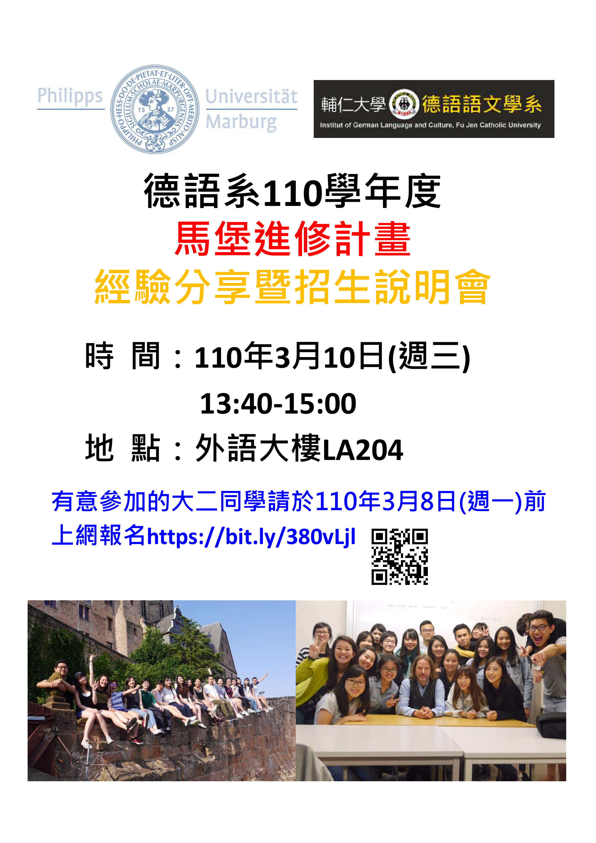 2021/03/07 00:20 [招生訊息]110學年度德語系學生赴德國馬堡大學進修計畫申請 (截止日:110.04.08)