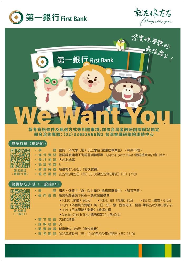 2022/02/24 18:51 [企業徵才]【第一銀行】招募德語組行員暨儲備核心人才