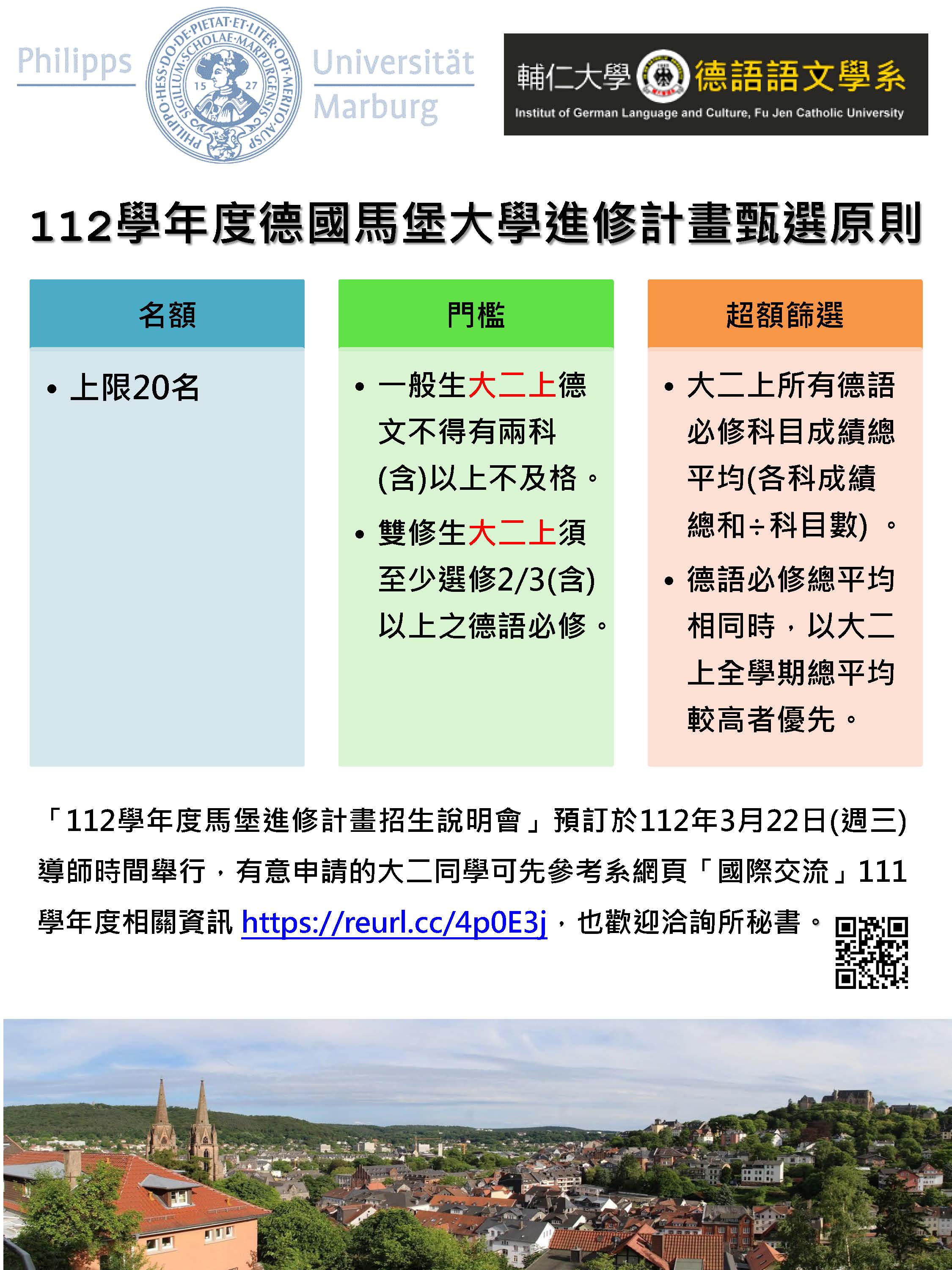 2022/10/11 09:49 [招生訊息]112學年度大三赴德國馬堡大學進修計畫甄選原則