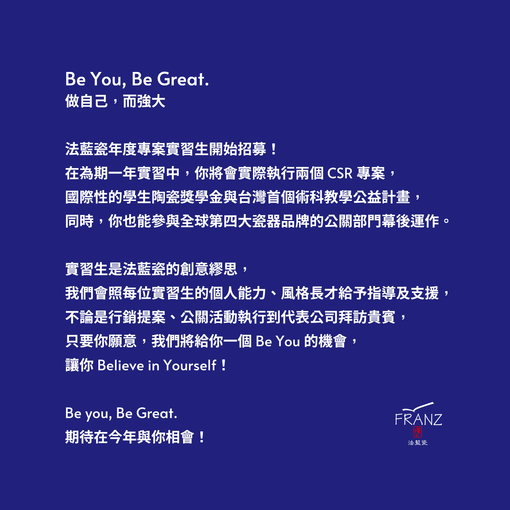 實習生是法藍瓷的創意繆思,我們會照每位實習生的個人能力、風格長才給予指導及支援,不論是行銷提案、公關活動執行到代表公司拜訪貴賓,實習生在團隊將扮演舉足輕重的角色。