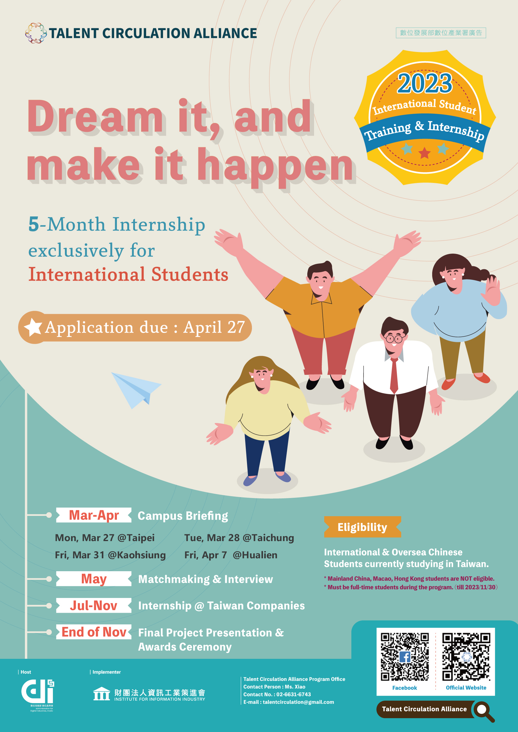 - 聯絡人: 資策會人才循環交流推動計畫辦公室-洪小姐,Email: talentcirculation@itri.org.tw,Tel.: 0800-035822轉2。