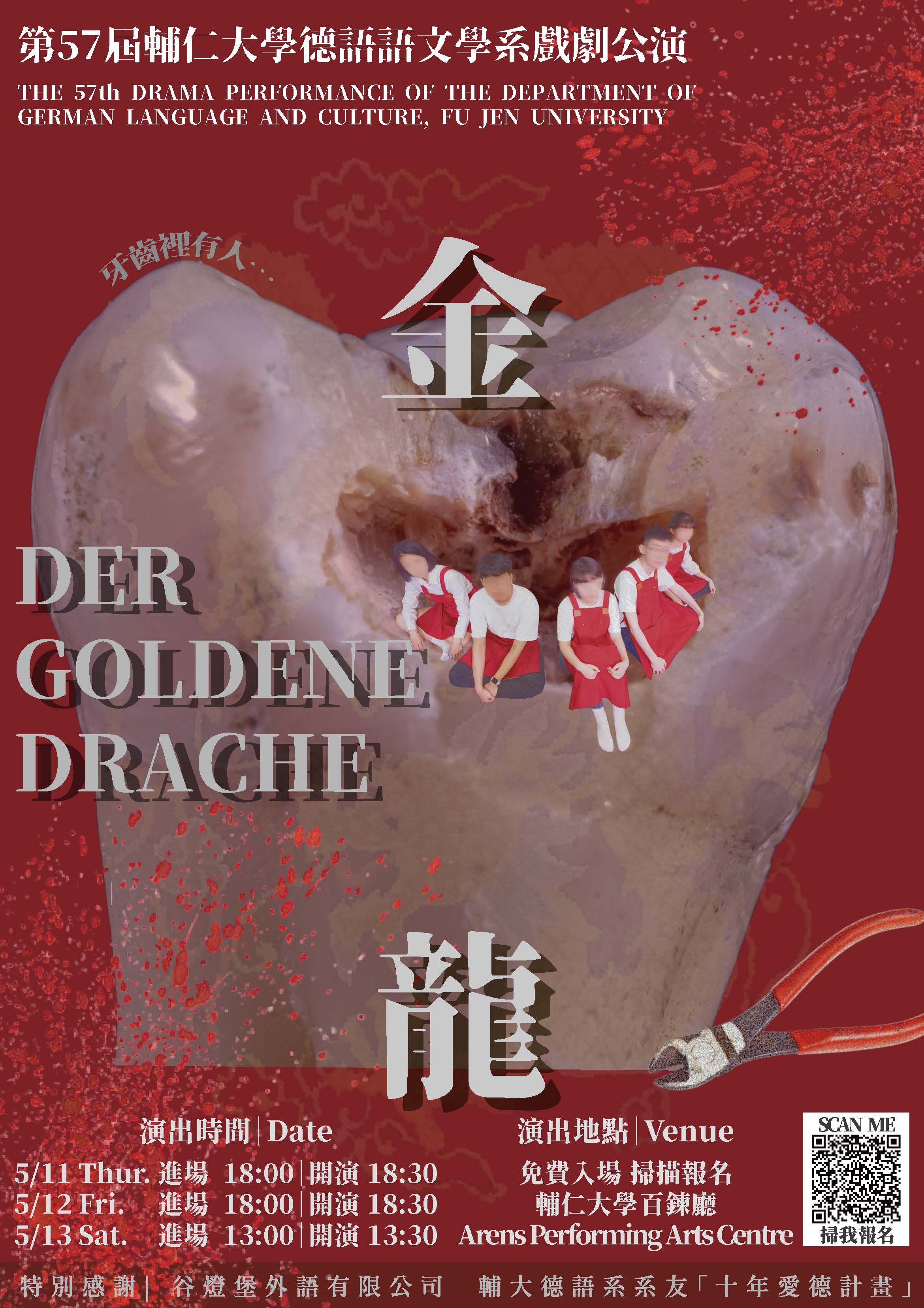 首先感謝各界對德語系2023戲劇公演《金龍》的支持,原訂2023/5/11至5/13於輔仁大學百鍊廳演出的《金龍》,因核心演員遭遇不可抗力之因素,為維護戲劇品質,不得不先行取消本週的三場演出,在此向您致上最深的歉意。