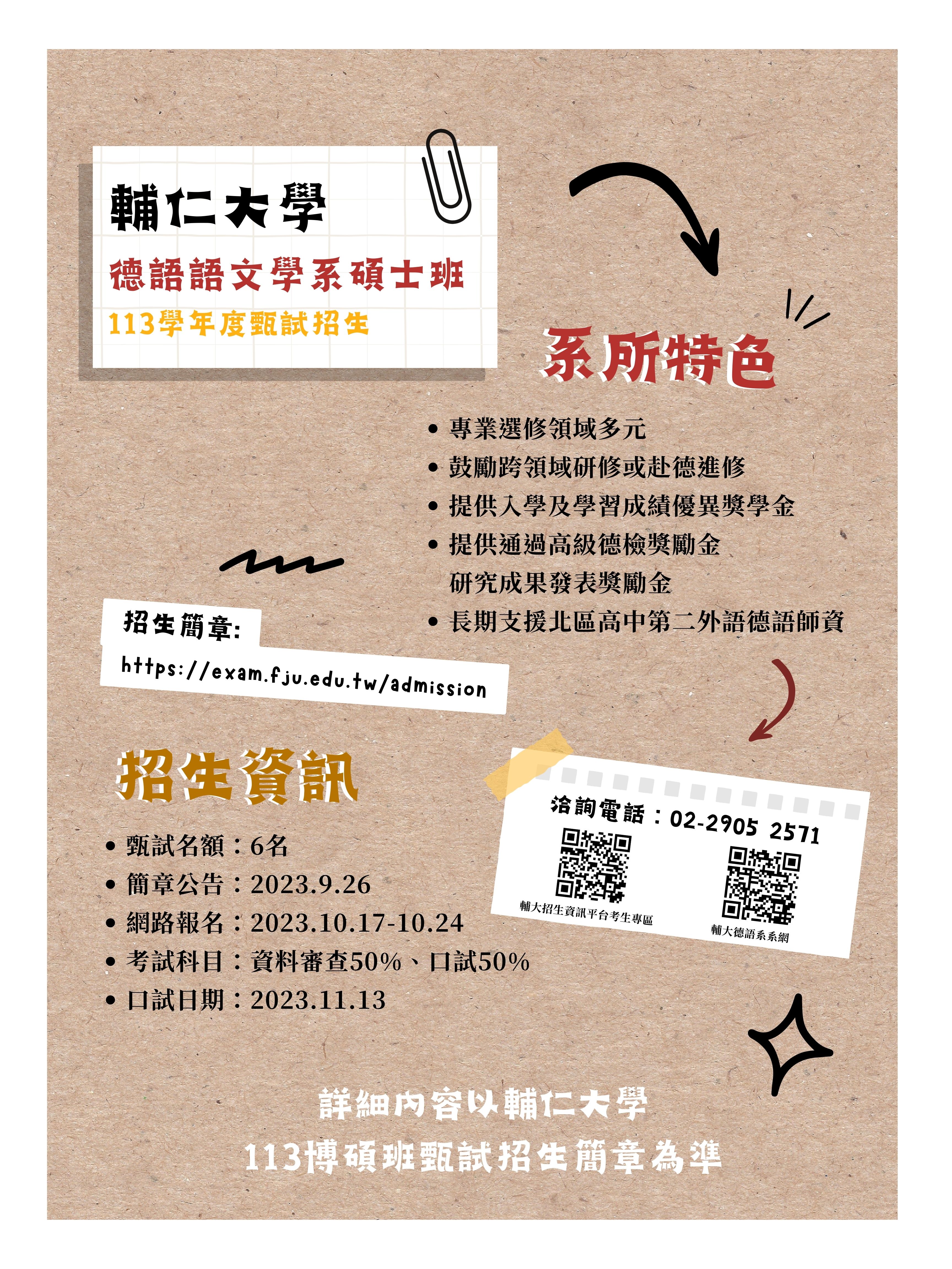 2023/09/28 13:07 [招生訊息]【輔大德語系113學年度碩士班甄試招生】(網路報名112.10.17~112.10.24)