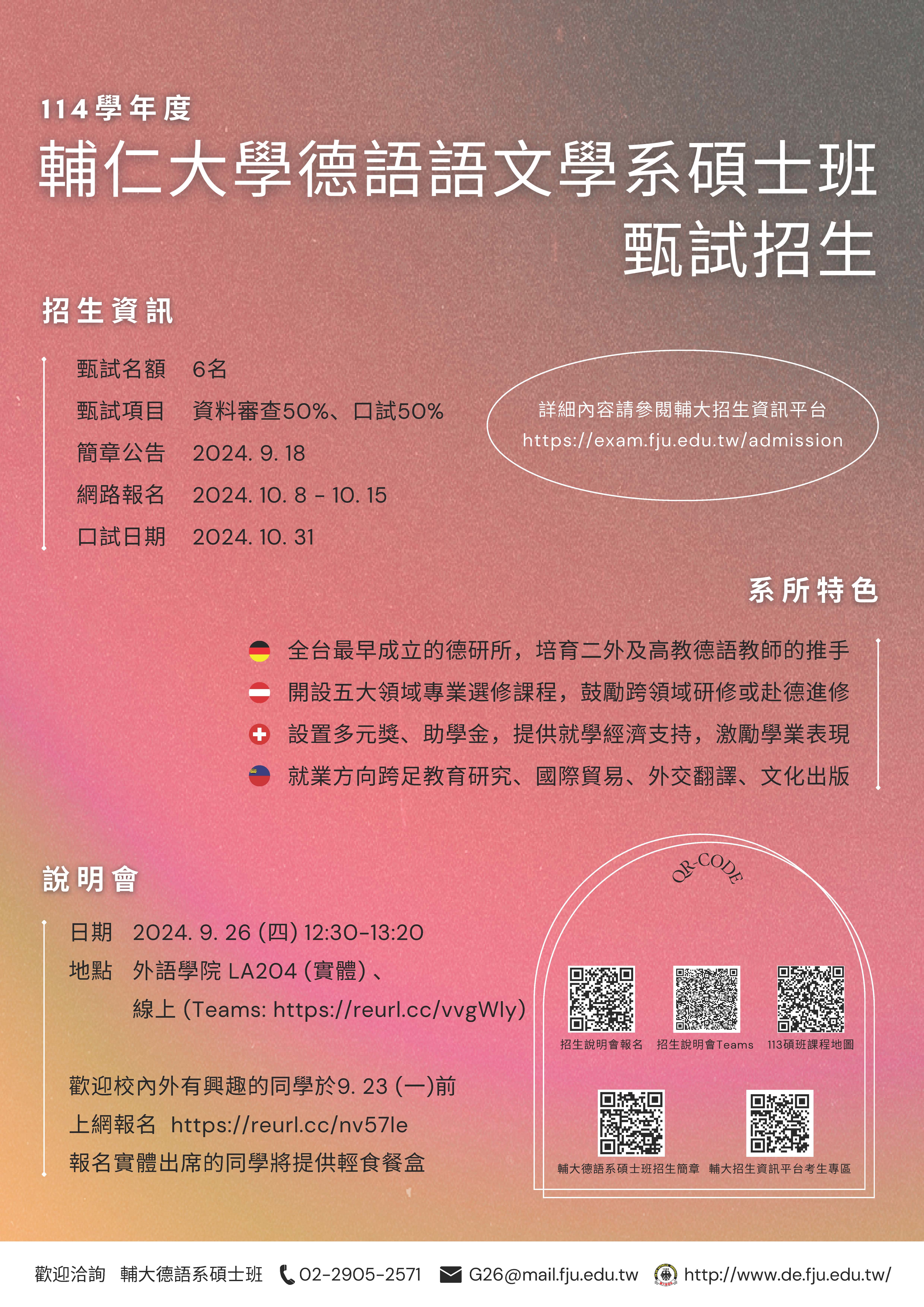 2024/09/13 12:45 [招生訊息]歡迎報名113.09.26(四)德語系碩士班114學年度招生說明會