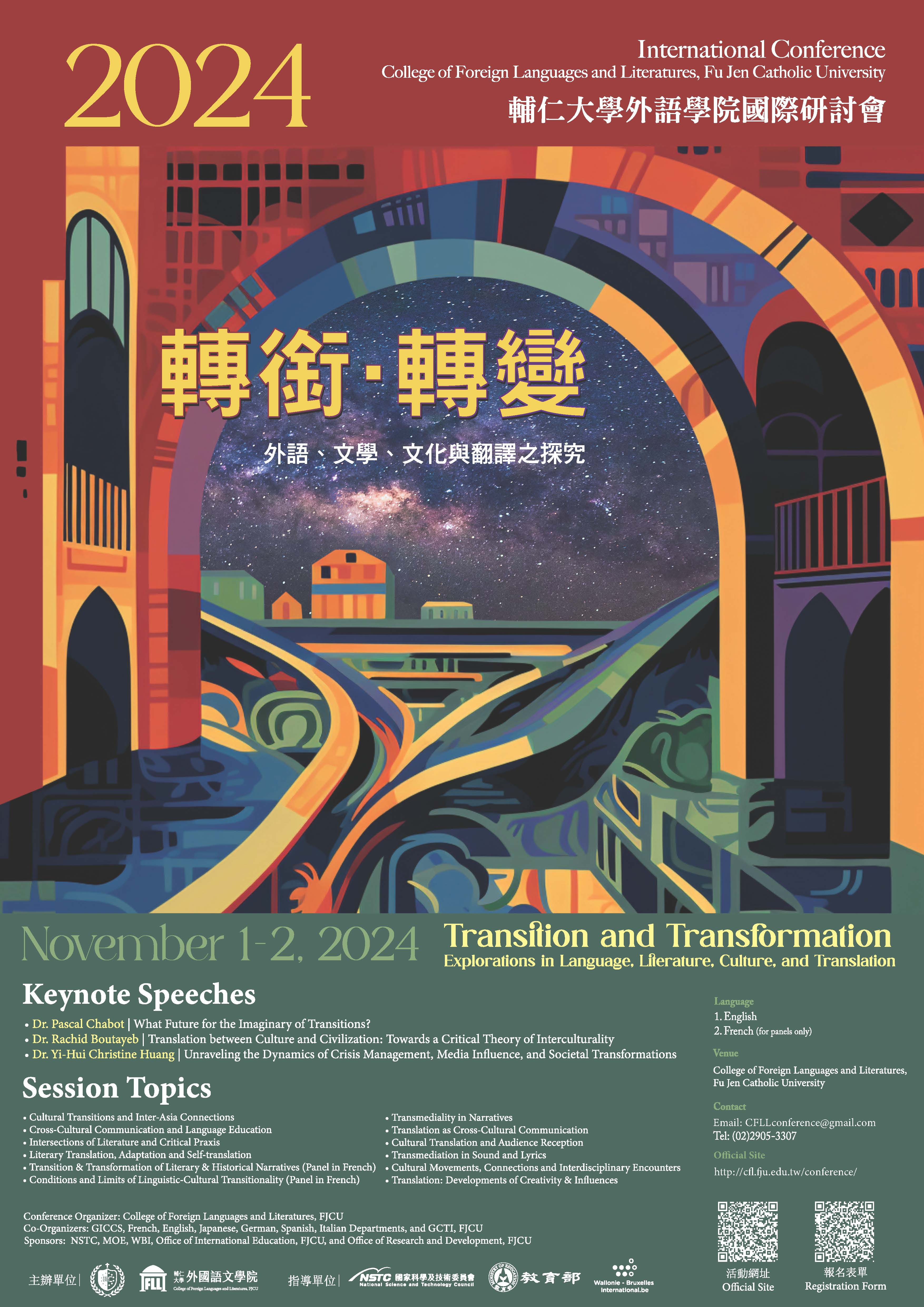 輔仁大學外語學院誠摯地邀請您參加「輔仁大學外語學院2024 國際研討會」,此次研討會將於2024年11月1-2日(星期五、六)假本校德芳外語大樓舉行,開幕式訂於11月1日上午8時45分。本研討會主題為「轉銜・轉變:外語、文學、文化與翻譯之探究」,特邀請三位學界重量級教授進行專題演講,講者與演講主題如下:
