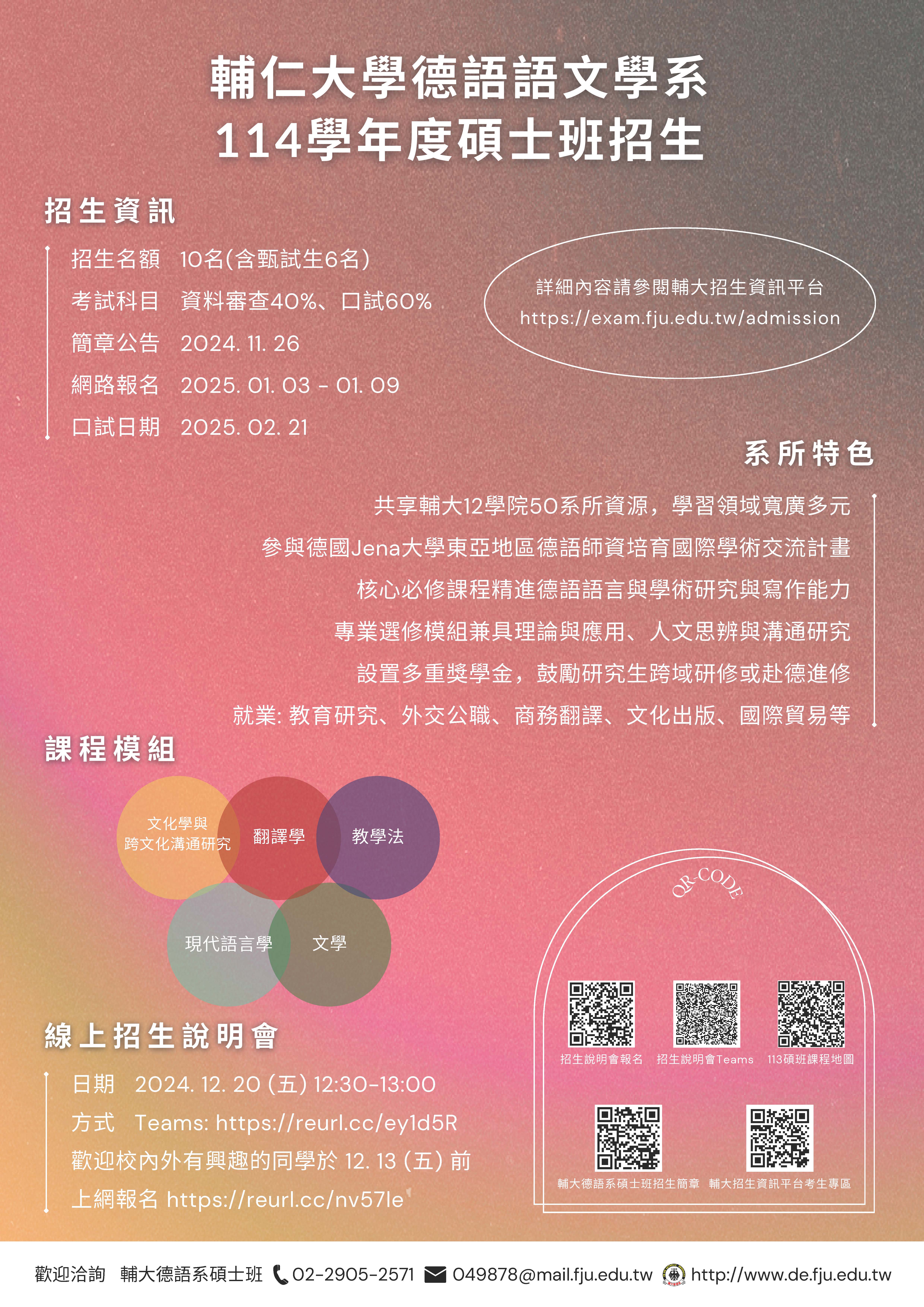 2024/11/26 15:03 [招生訊息]【輔大德語系114學年度碩士班招生】(網路報名114.1.3-114.1.9)
