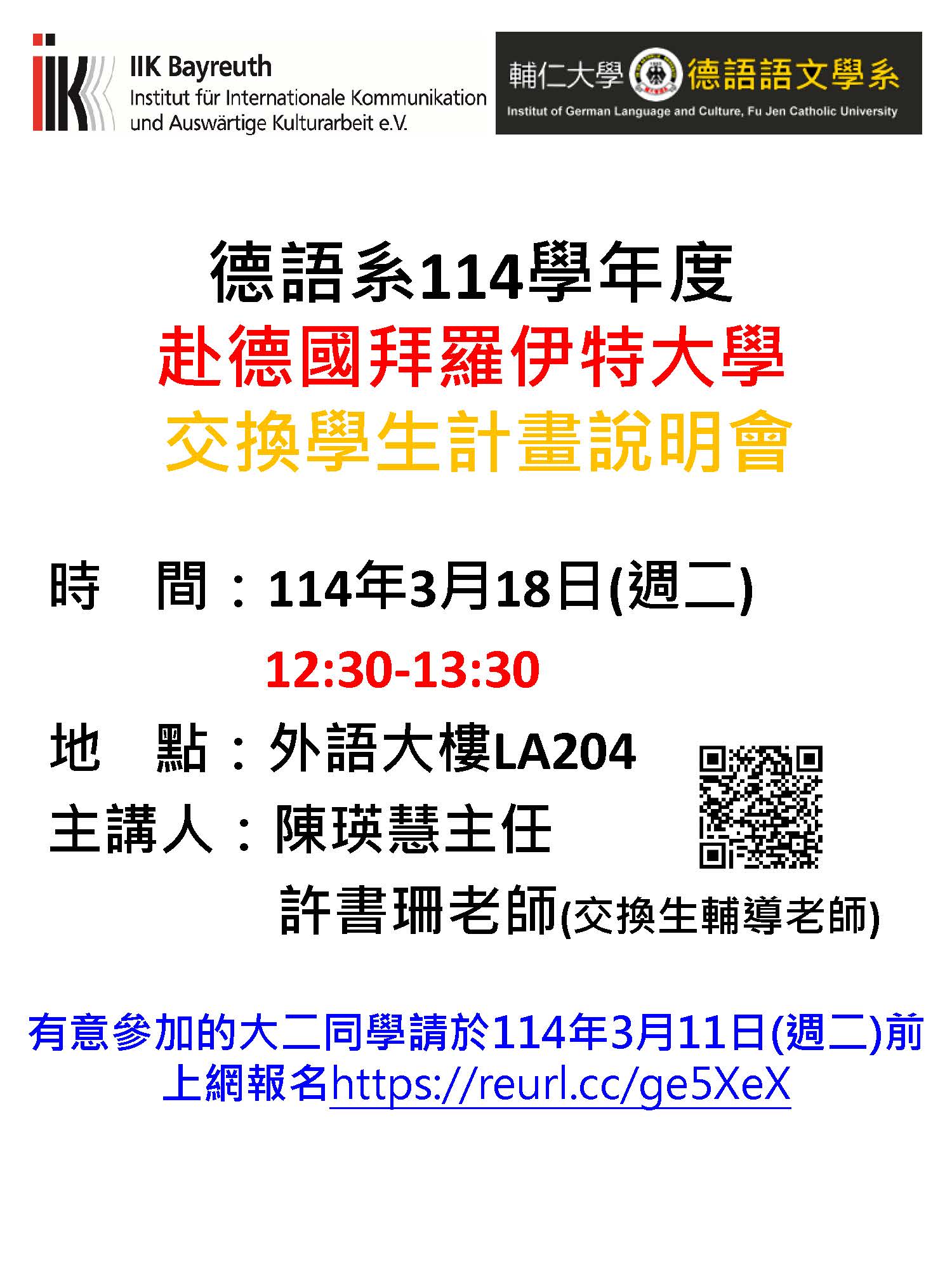 2025/02/20 14:22 [招生訊息]歡迎報名參加114學年度赴德國拜羅伊特大學交換計畫說明會(114.3.11截止)