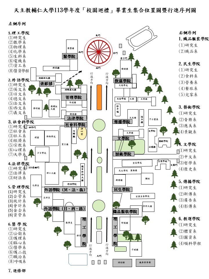 (一)請各學系在校生歡送學長(姐)者及應屆畢業生於上午08:30時前,穿著整齊服裝及學士服至指定位置,參加校園巡禮活動。