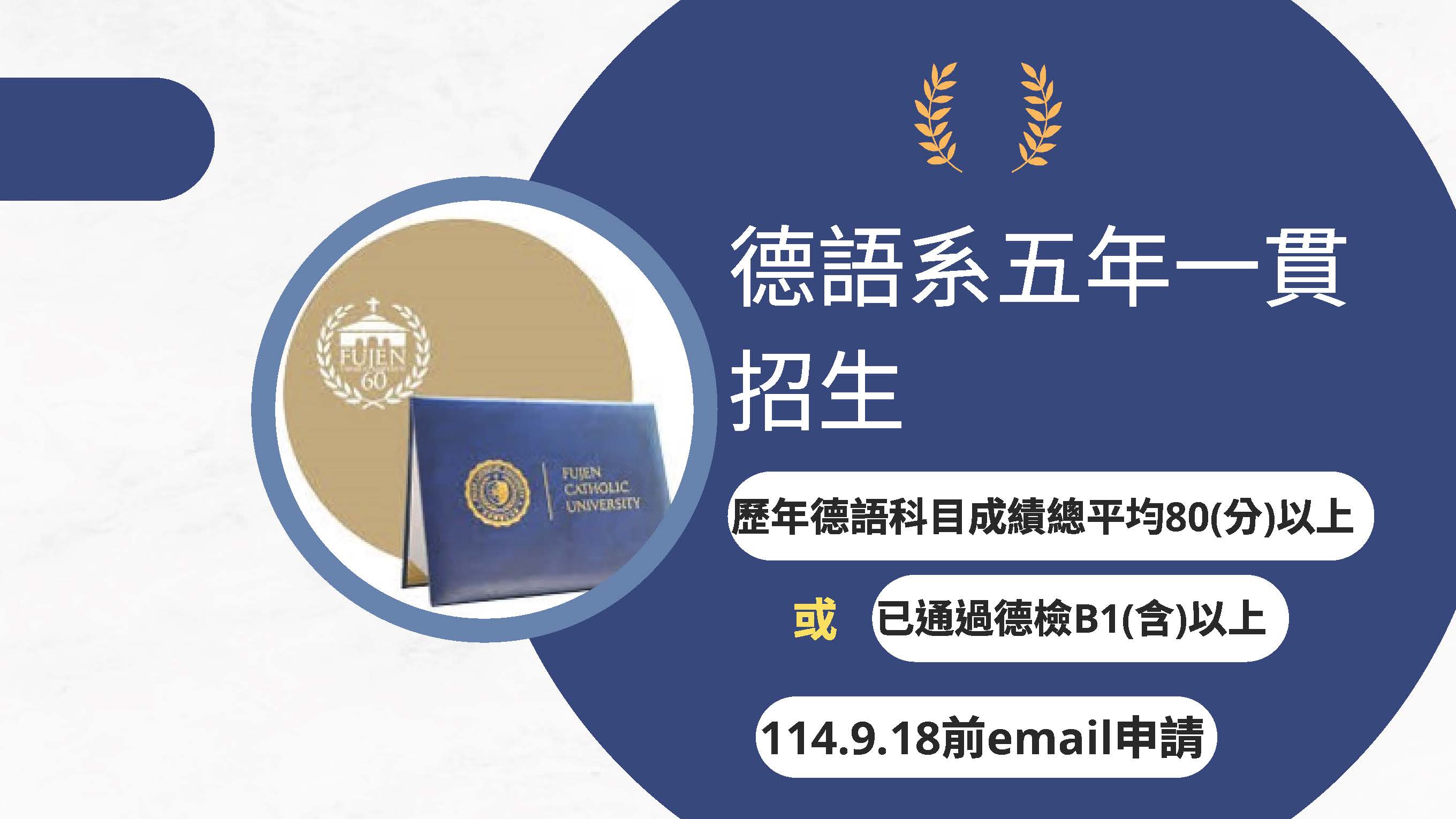 2025/08/29 15:00 [招生訊息]114學年度第1學期德語系學⽣修讀「學、碩⼠學位五年⼀貫辦法」甄選申請公告 (114.9.18週四截⽌)