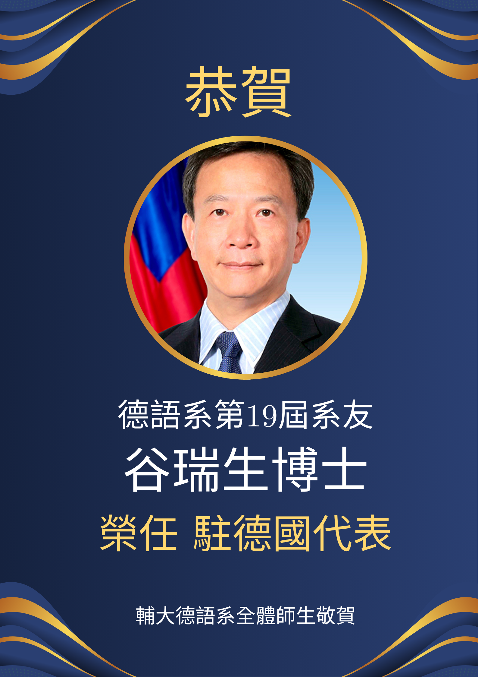 恭喜輔大傑出校友谷瑞生博士(德語系第19屆系友)榮任駐德代表,德語系全體師生敬賀