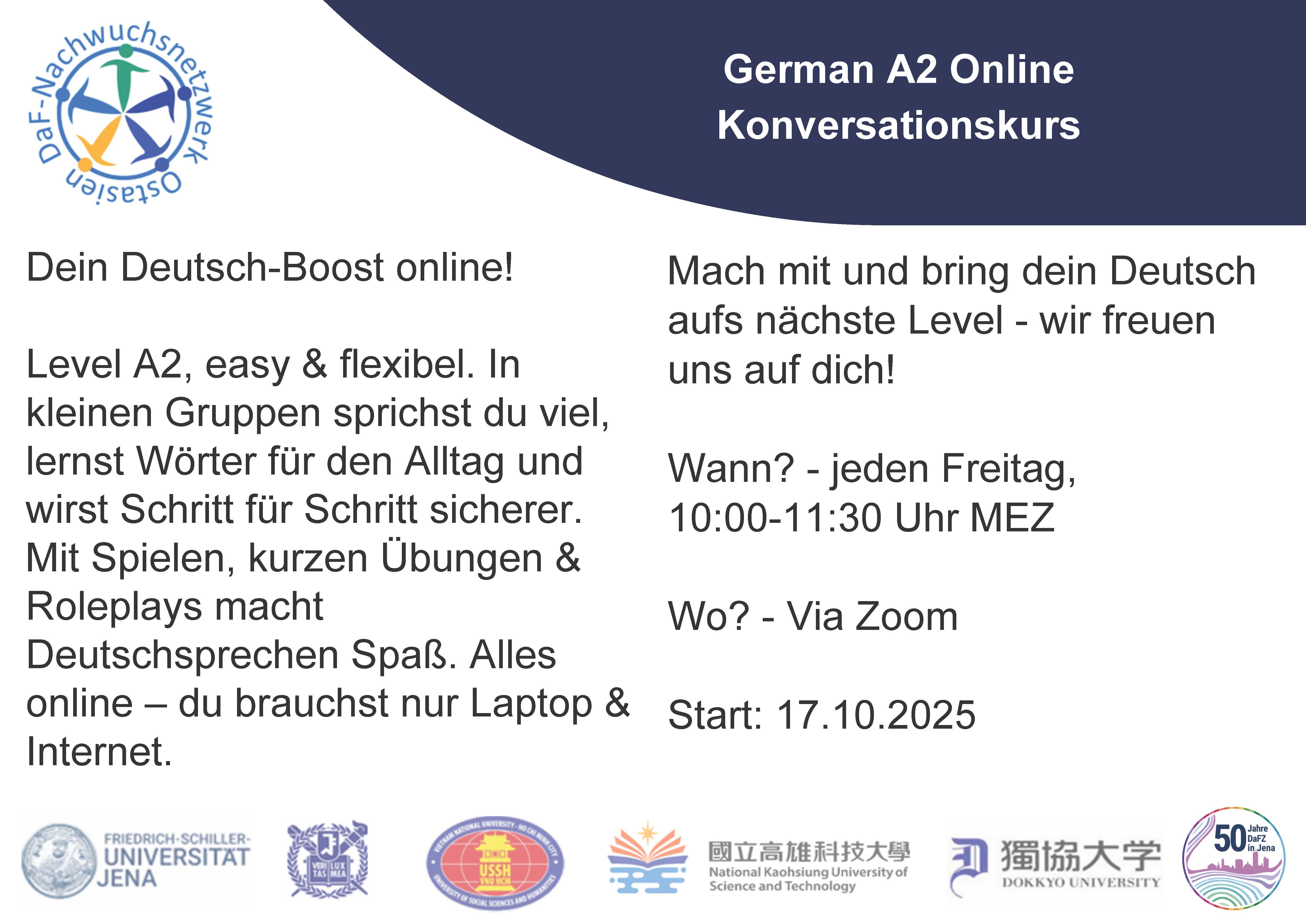 由德國耶拿大學主導、德國學術交流總署(DAAD)資助的「東亞地區德語師資培育國際學術交流計畫」,目標是透過大學間的國際合作來強化德語師資培育,促進跨國學術交流。目前參與的學校包括獨協大學(日本東京)、麗澤大學(日本東京)、首爾國立大學(韓國首爾)、國立高雄科技大學,以及輔仁大學。